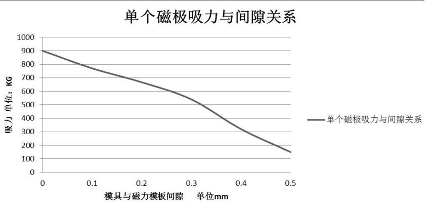 檢查吸塵對象的表面粗糙度,估算吸塵對象與磁極之間的平均氣隙,然后根據圖7.1查詢單個磁極的吸力。 例如:當模具與磁性模板之間的平均氣隙為0.5mm時,單個磁極產生的吸引力為150KG;當模具與磁性模板之間的平均氣隙為0.2mm時,單個 磁極當產生的吸力為680KG且模具與磁性模板之間的平均氣隙接近于0時,單個磁極產生的吸力為900KG